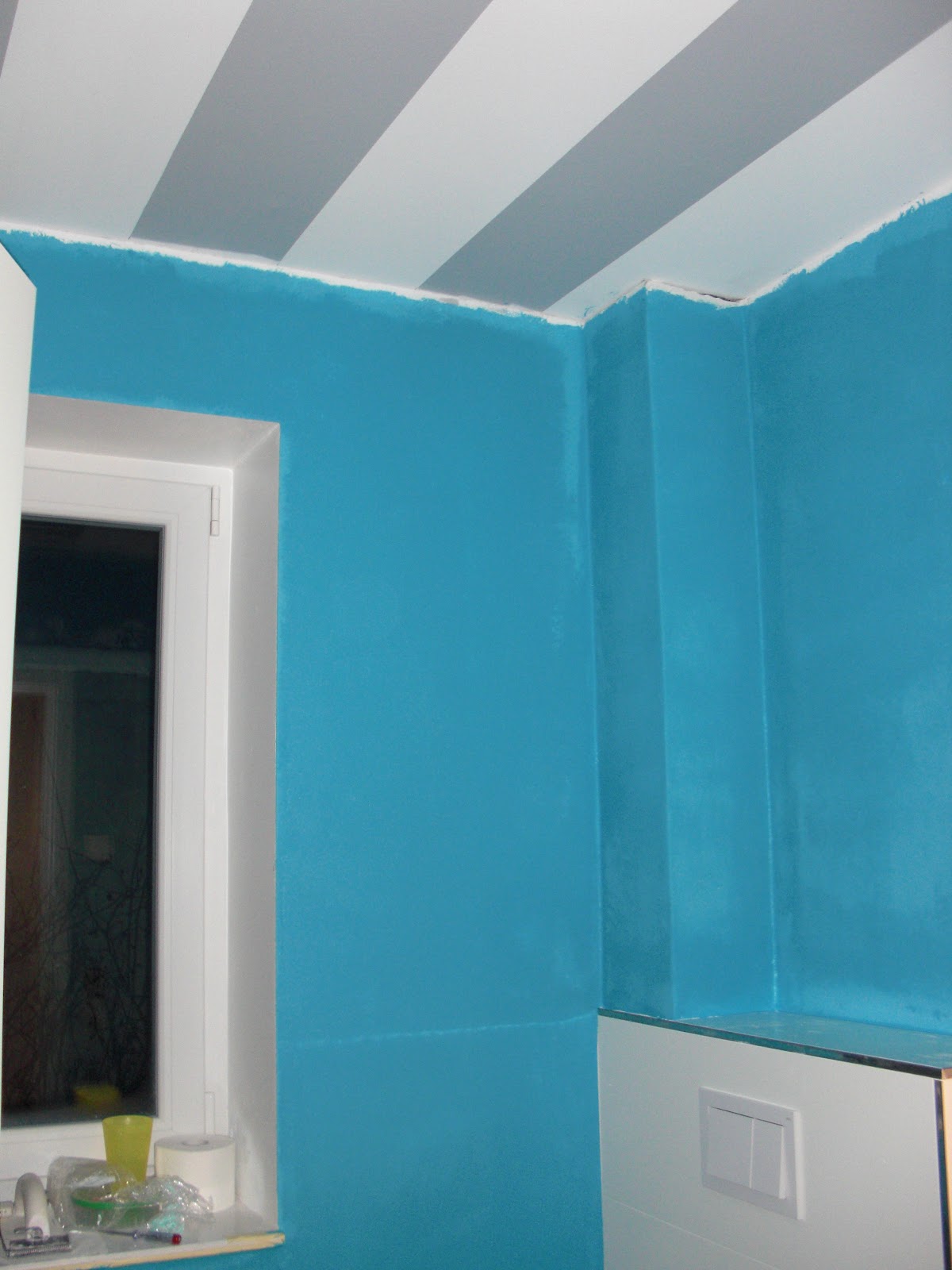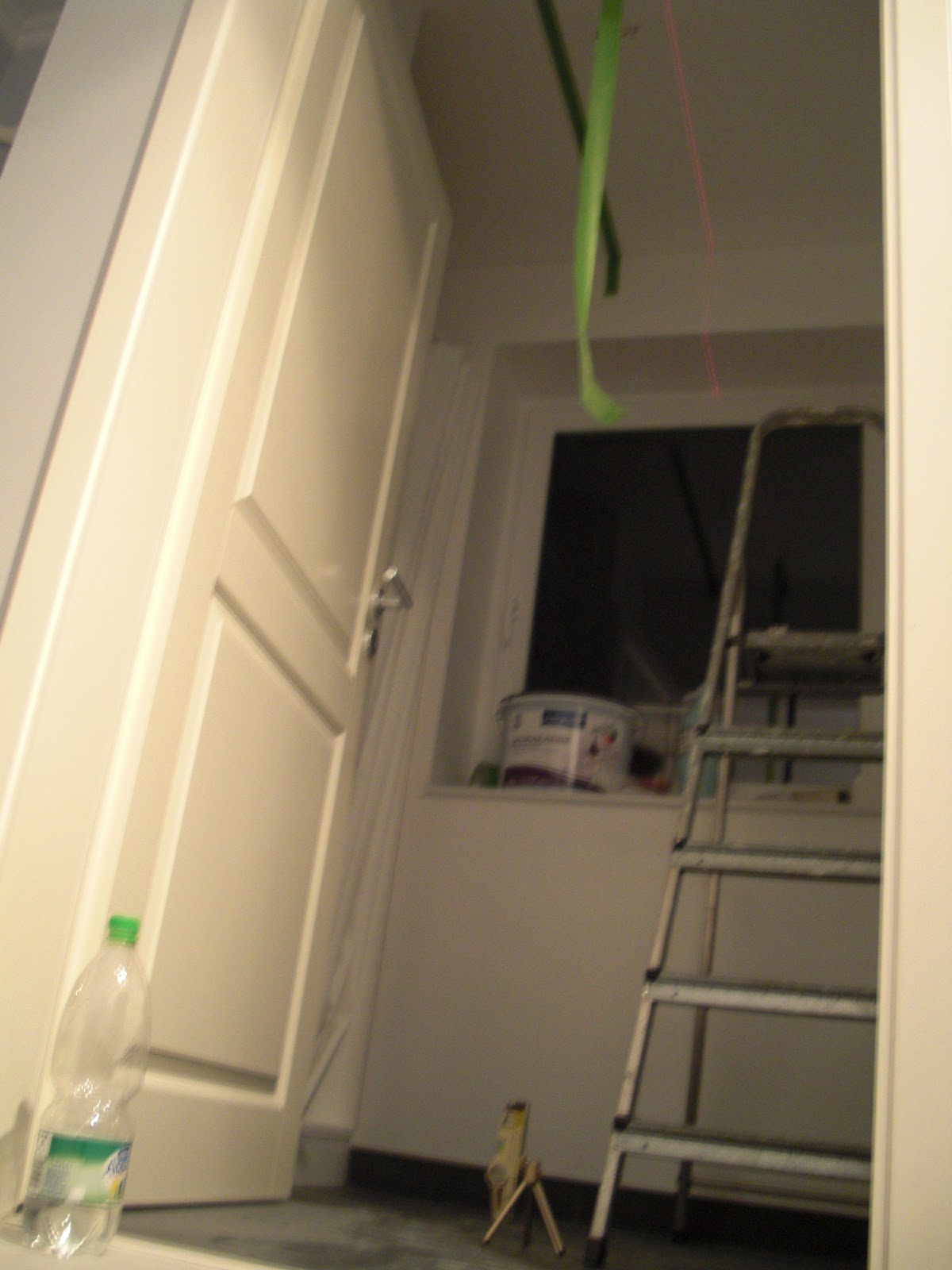 Weiter ging es mit den Wänden. Nachdem ich bei den Streifen an der Decke die Reste vom grau testen (für Flure, Wohnzimmer und HWR) genutzt habe, habe ich auch für die Wandfarbe eine sparsame Lösung gefunden und die Farbe aus der Küche mit der Farbe aus dem Wohnzimmer in der letzten Wohnung abgetönt. Zwar hätte ich auch Lust auf Orange oder so etwas gehabt, aber ich wollte auch nicht dass das Haus Villa Kunterbunt wird…