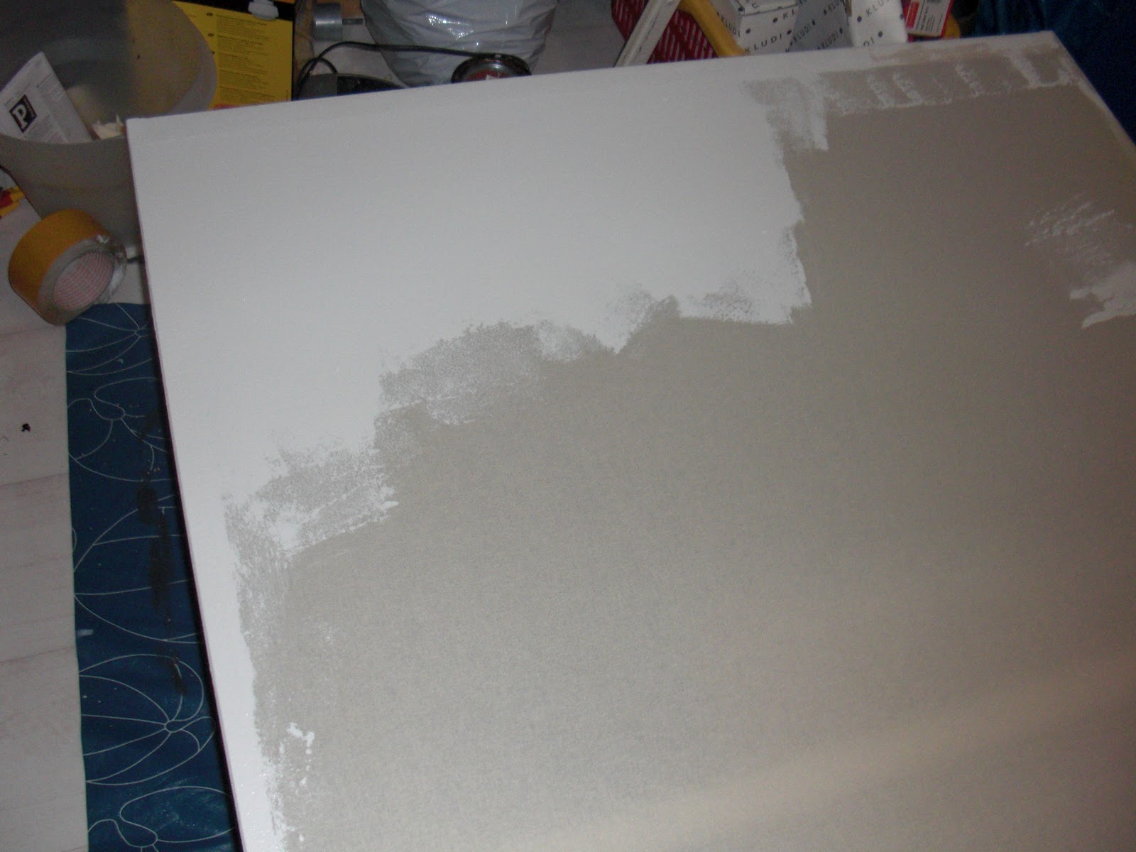 Damit es zur Leinwand wird habe ich es mit ner Rolle mit weißer Mattlatexfarbe (Reste der Deckenfarbe) grundiert.