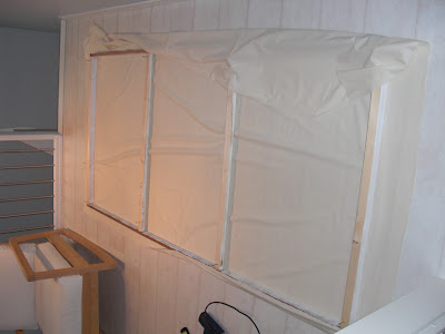 und dann mit dem günstigen ikea-Stoff bespannt (natürlich mal wieder mit dem Elektrotacker von der lieben Verwandschaft der sich hier inzwischen genau so zuhause fühlt wie da).