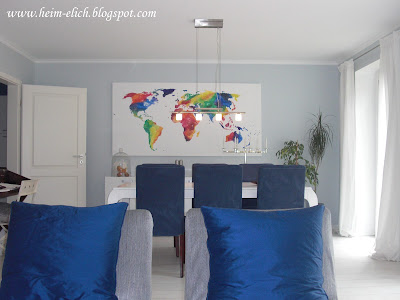 Mit dem Bild dahinter gefällt mir die Esstisch-Lampe wieder sehr gut ohne den Lampenschirm, also bastel ich vielleicht doch keinen langfristigeren mehr…