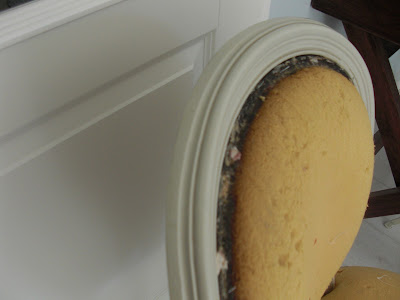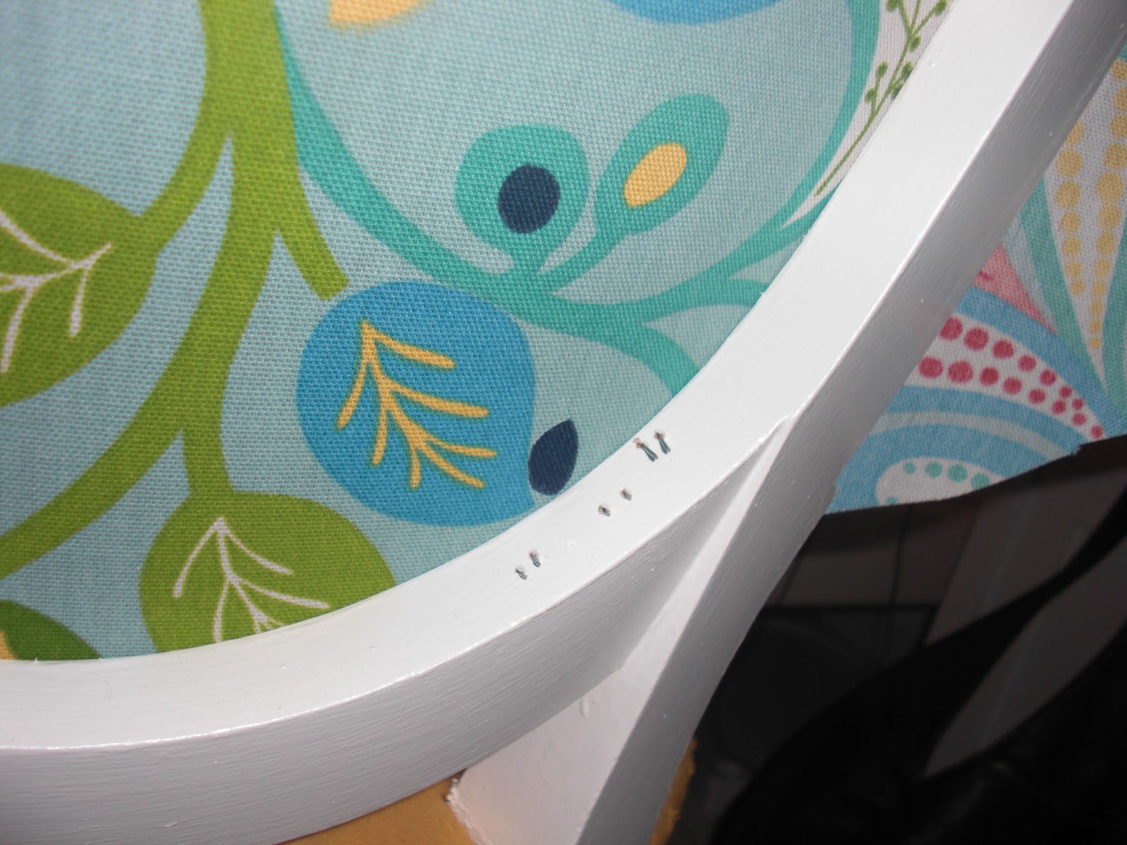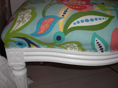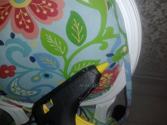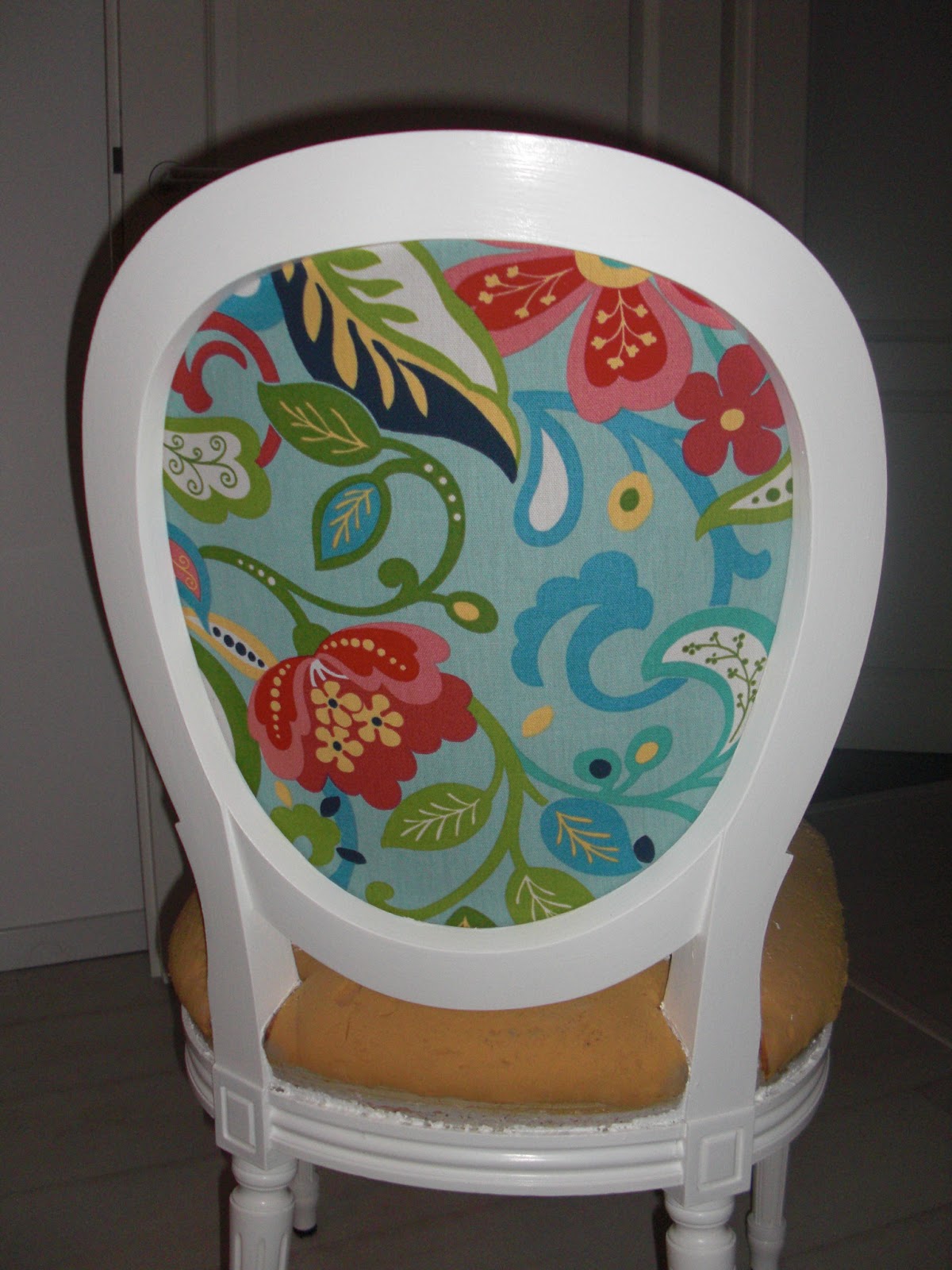 Die Rückenlehne von hinten war ganz leicht neu zu beziehen. Einfach mit Sprühkleber den Stoff fixiert und zurecht geschnitten und wieder in den Stuhl und mit ein paar wenigen Tacker-Nadeln fest.