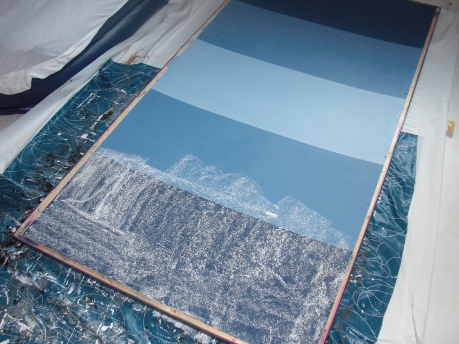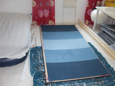 Ansonsten war ja alles da, ein Rahmen und ein Platte. Für mehr Abwechslung habe ich die Farbe in 3 Abtönungen (original und mit weiß und mehr weiß, nach Bauchgefühl) gestrichen. Je Farbe 2 Schichten. Trocknet recht schnell an, so dass ich zwischen den Schichten nur ganz kurz gewartet habe. Dann direkt das Klebeband für die Streifen abgezogen. Damit es noch schneller ging habe ich die Kanten jeweils mit dem Fön getrocknet, damit ich das Klebeband von der anderen Seite wieder drauf kleben konnte und den nächsten Streifen starten konnte.