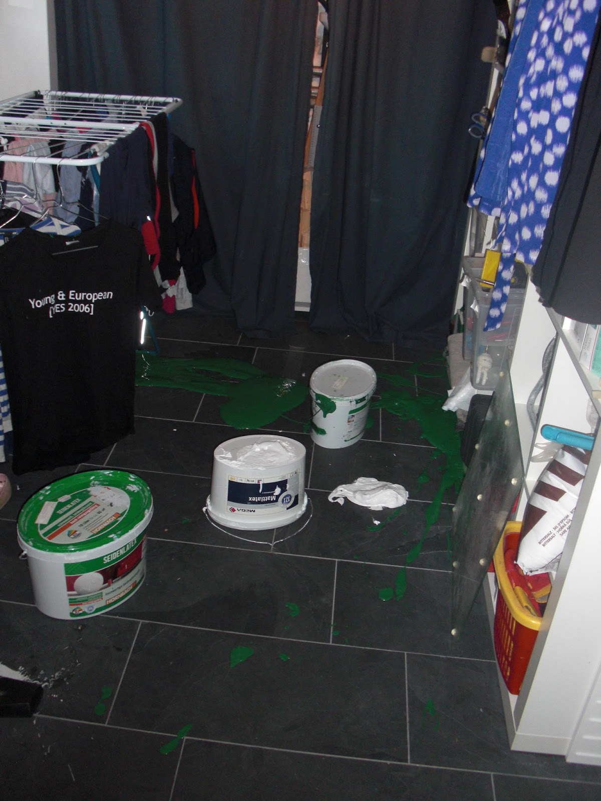 So bekommt man also Latexfarbe wieder von den Fliesen und Fugen wenn man so dusselig war einen Eimer davon runter zu schmeißen.