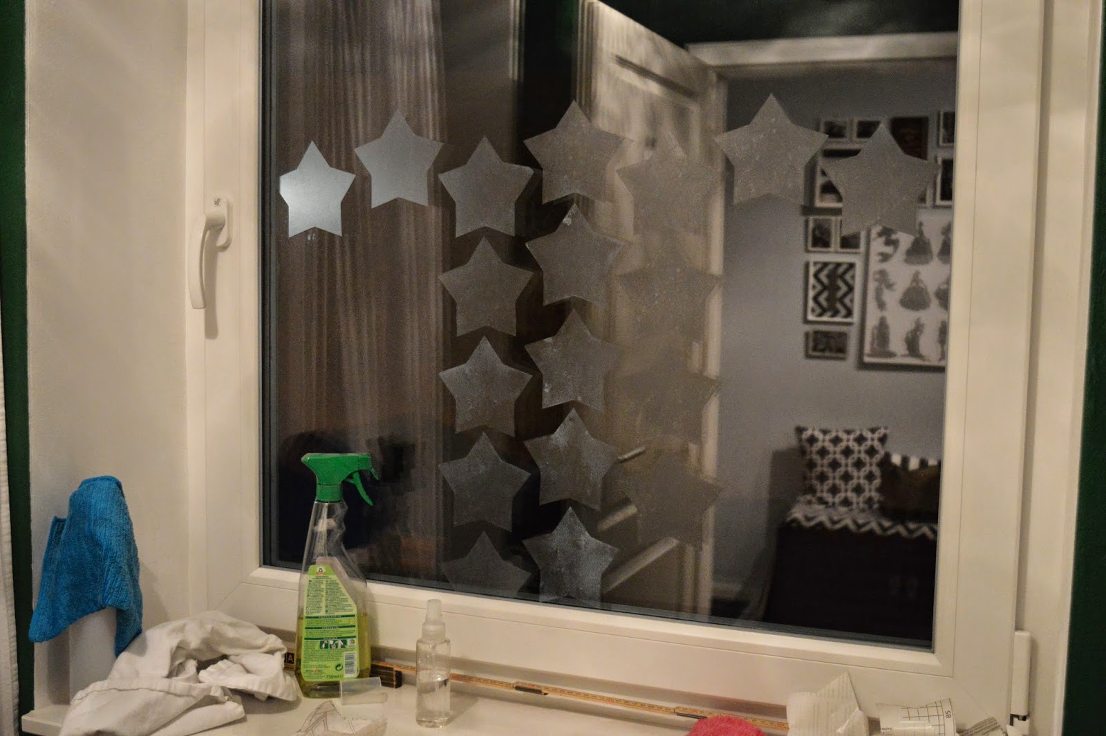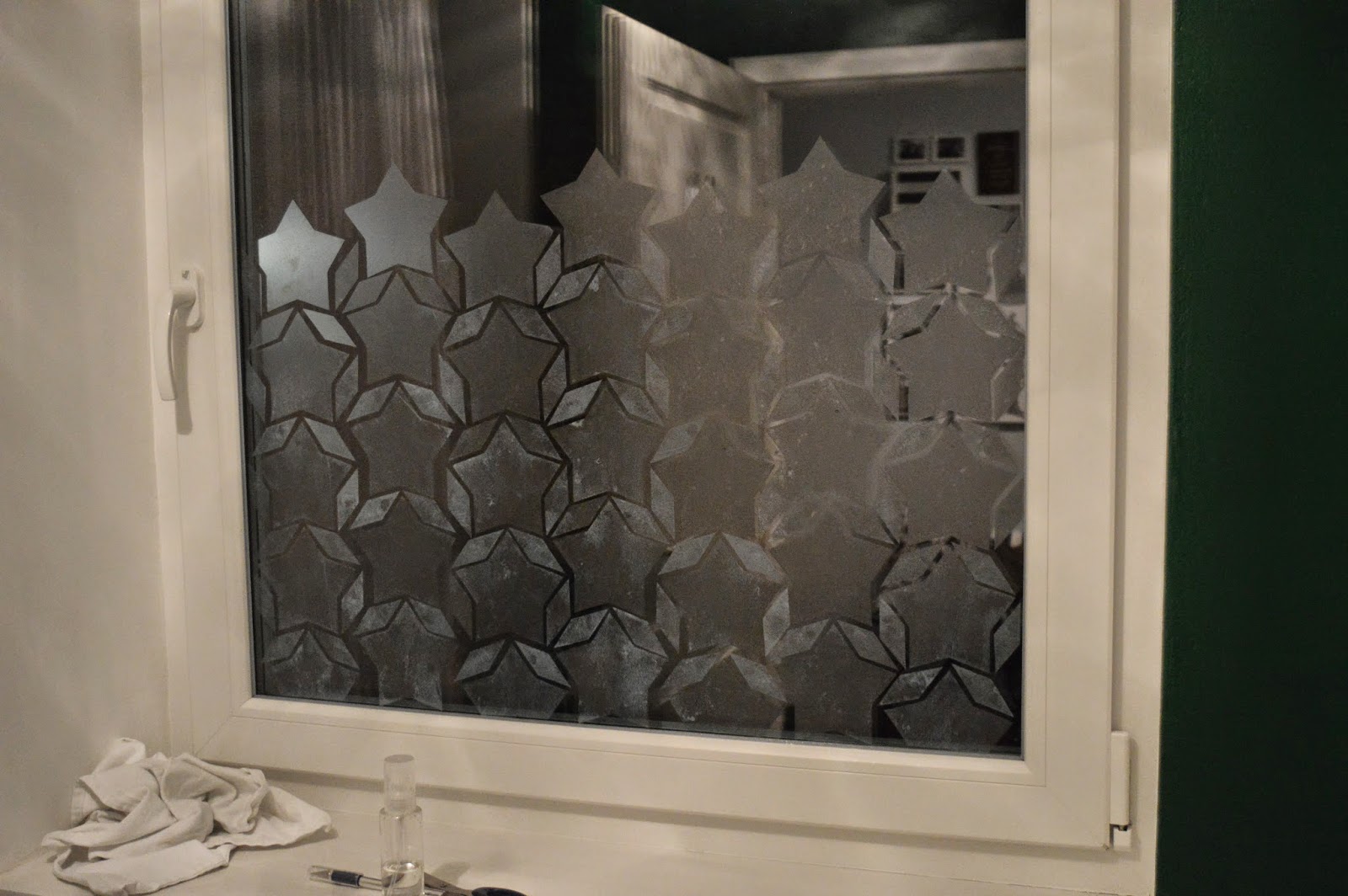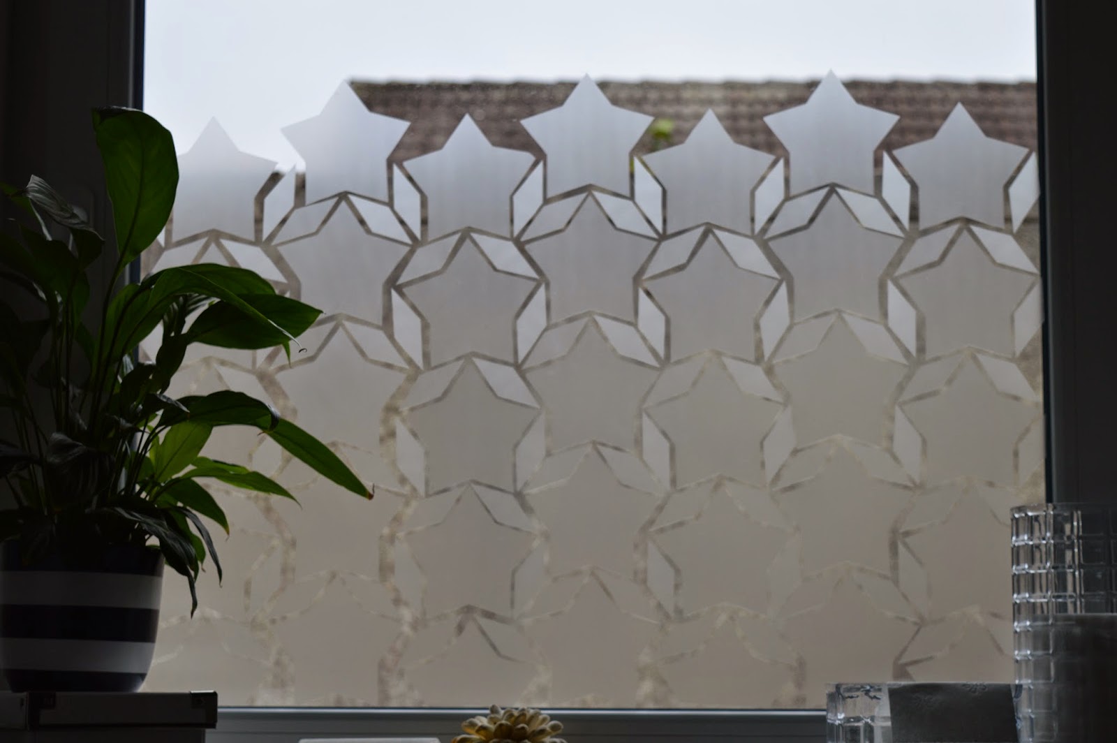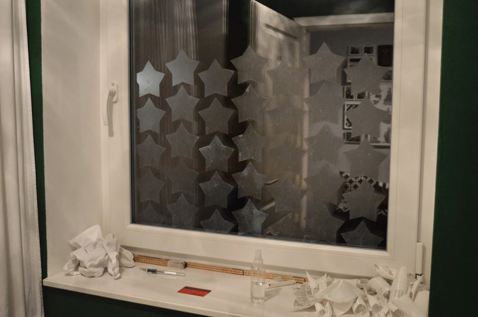 Ich habe mit Absicht erst die Sterne gemacht um zu sehen wie ich die Abstände finde und ob ich sie noch füllen will. Da es ja ein Sichtschutz sein soll habe ich mich für mehr Folie entschieden und die Salmiaks aber nicht mit einer Schablone sondern mit Lineal und Geodreieck auf die Folie gemalt und so schnell in großen Mengen zuschneiden können.