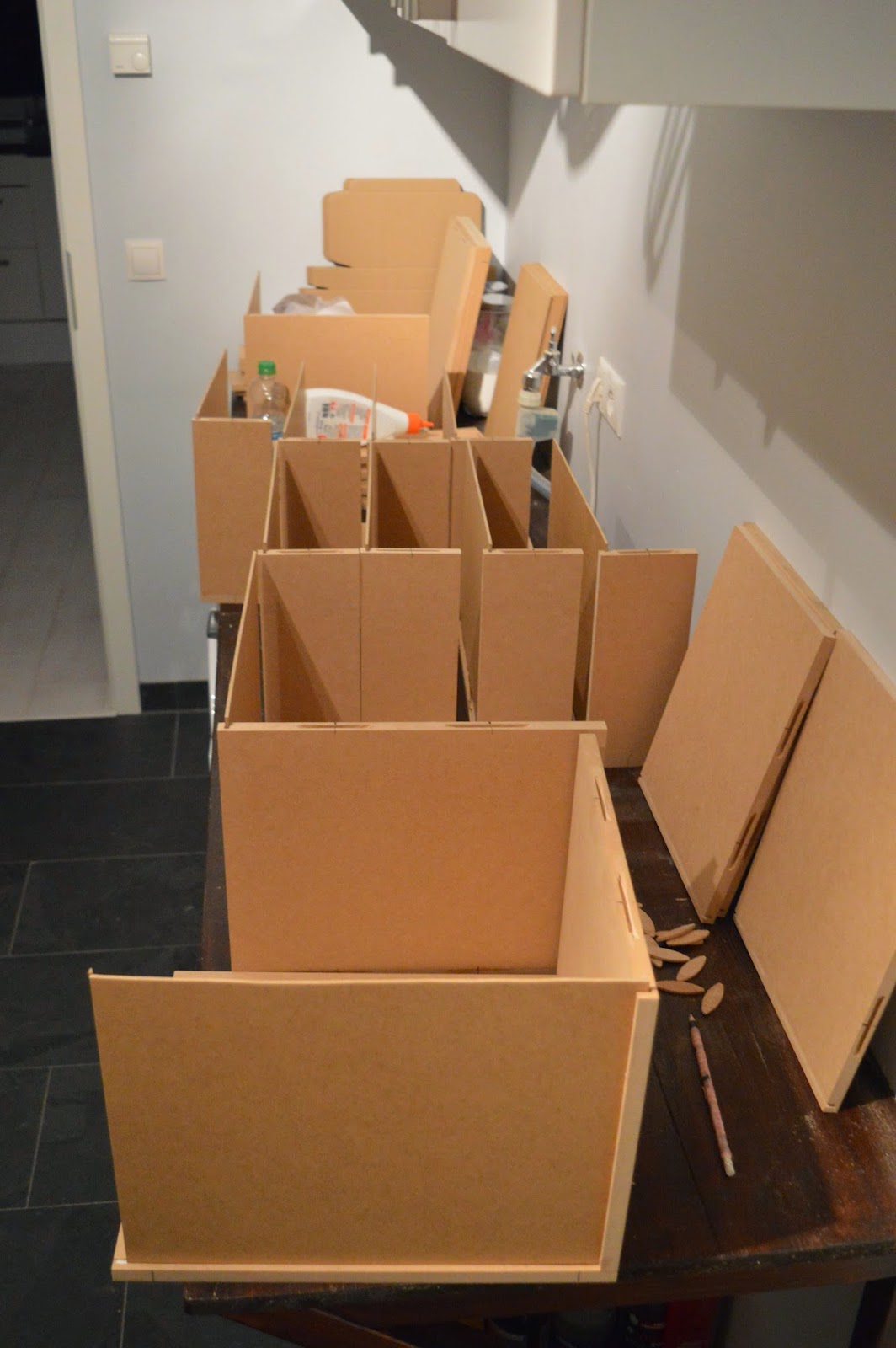 mit Hilfe von Flachdübeln und Leim Kisten zusammengesetzt,