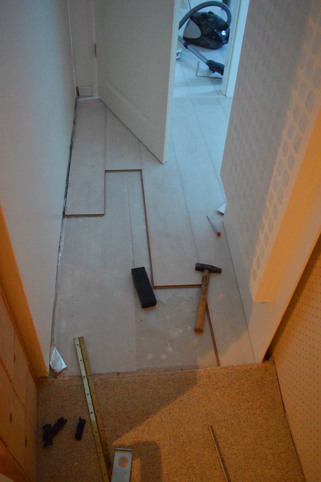 Ich habe es erst mit einer dünnen Aluleiste, statt der Übergangsleiste im Laminatdekor versucht, aber dann ging die Tür nicht ordenlich auf usw. Wenn ich schon so viel Energie rein gesteckt habe will ich mich nicht jedes mal ärgern, also habe ich noch mal tief durchgeatmet und neues Laminat vom Dachboden geholt und das ganze verlängert.