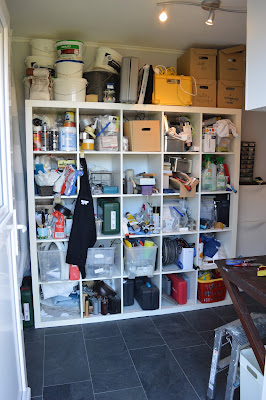 Da das Regal ja ein Ikea Klassiker ist, waren deren Boxen natürlich eine optimale Lösung, erst recht als ich 6 davon zum Schnäppchenpreis bei e-bay gefunden habe; dass die dann nicht mehr so ganz frisch waren, war mir egal, so muss ich mich nicht ärgern, wenn Sie beim werkeln mal was abbekommen.