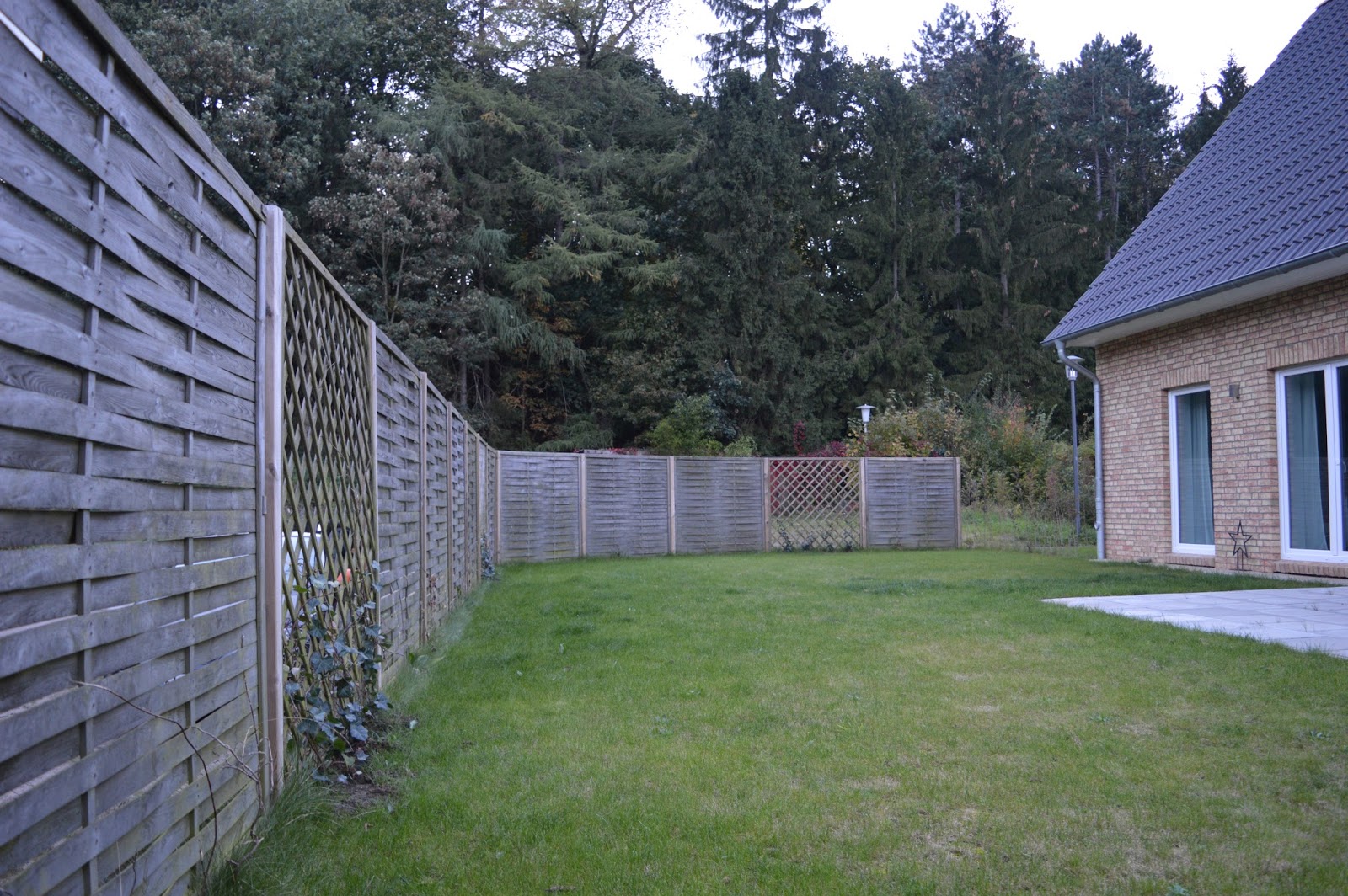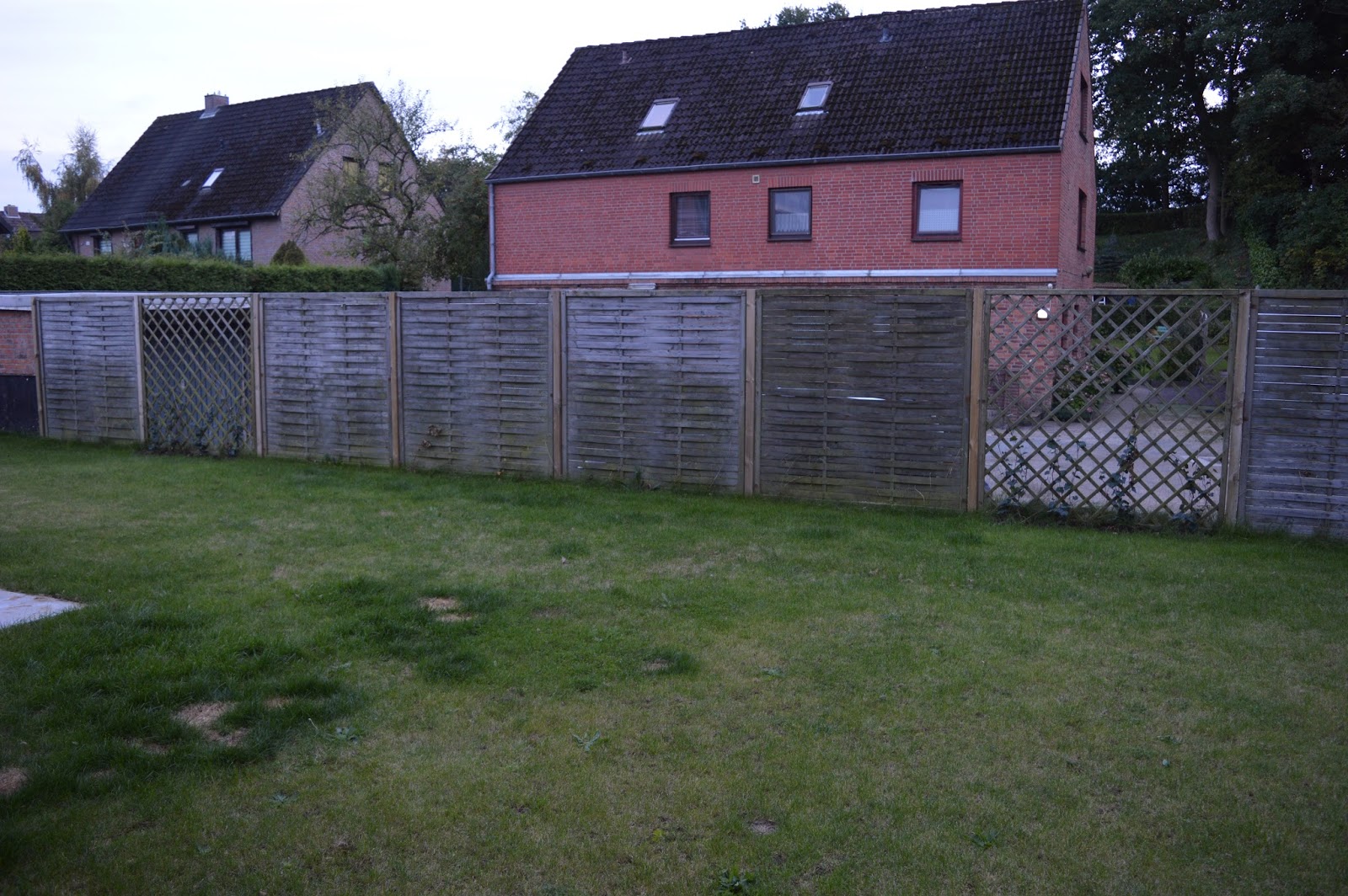 Die Hecke vom selben Händler am Zaun nach Osten hat sich auch schon richtig gut eingelebt und ist ein gutes Stück gewachsen. Damit sie sich auch weiterhin richtig wohl fühlt (und alles schön ordentlich aussieht) habe ich die Grasreste, welche durch abstechen und umdrehen nicht eingegangen sind, entfernt und 5 Säcke Mulch verteilt.