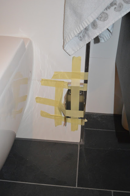 Die Halterungs habe ich mit „kleben statt bohren“ an den Fliesen im Gästebad befestigt (hier der vorher).