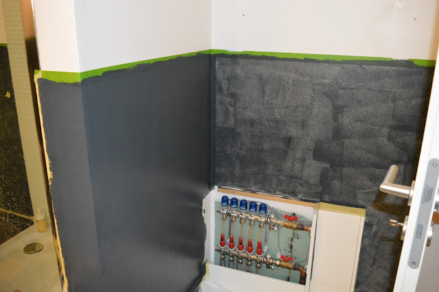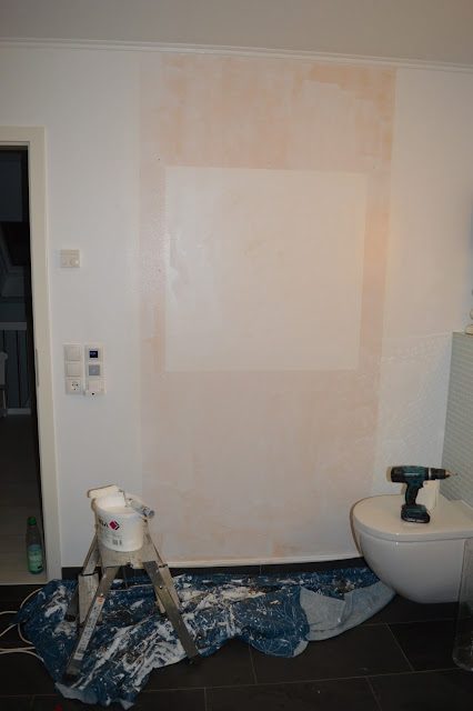 Am Samstag habe ich dann beherzt zu dunkler Farbe gegriffen – rundherum auf 120 cm (Höhe des Fliesenspiegel hinter WC und Waschbecken)