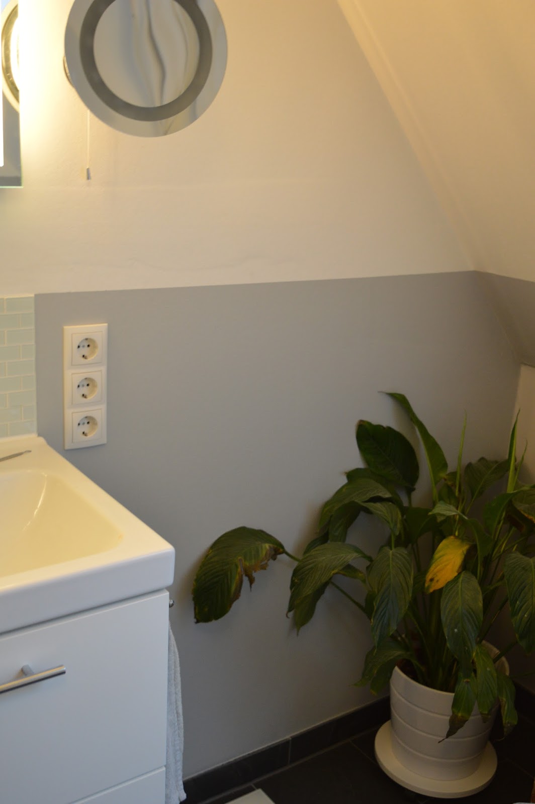 Als Farbe habe ich (ohne langes Testen / Überlegen…) einfach das Anthrazit grau des Waschbeckenunterschranks anmischen lassen. Nach 2 Schichten konnte man die Farbe schon erkennen.