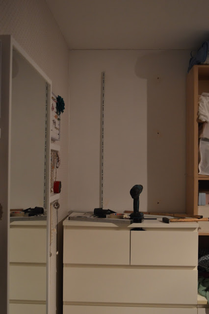 Das geeignete Plätzchen habe ich in der Ankleide gefunden und mit einfachen Wandschienen-Regalen ausgestattet: