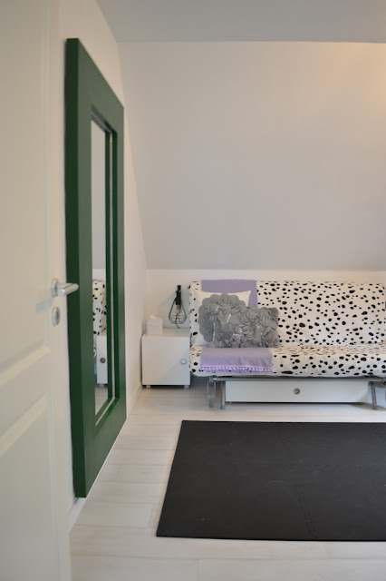 Und hier das FERTIGE Zimmer mit bemalten Spiegel, Schlafsofa mit Pünktchenbezug und Bettkasten, DIY Vorhang, silber Deko Hund, Hantellager, umgestalteten Nachttischen, ein und noch ein DIY Kissenbezug, gepimpten Nachtischlampen und schicker Deckenlampe: