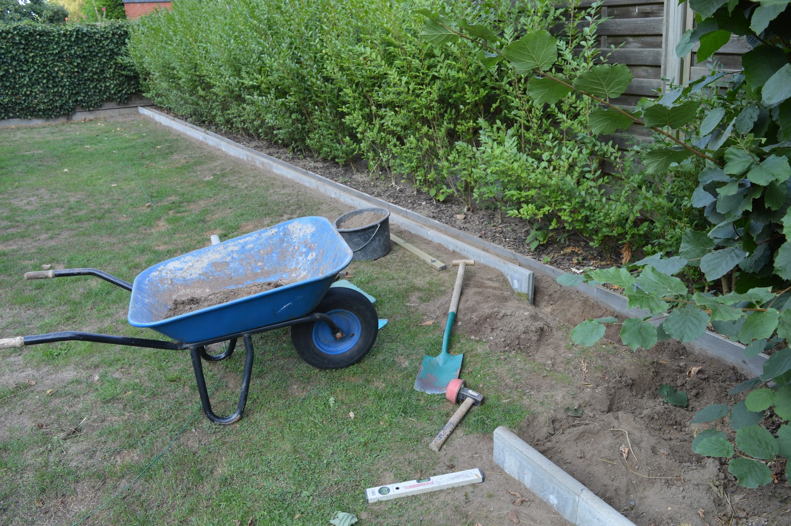 Next Step: eine 20 cm Pflasterkante auf Rasenhöhe entlang der selben 45 Meter einbauen und zusätzlich entlang dem nördlichen Zaun und der Rückseite des Hauses…